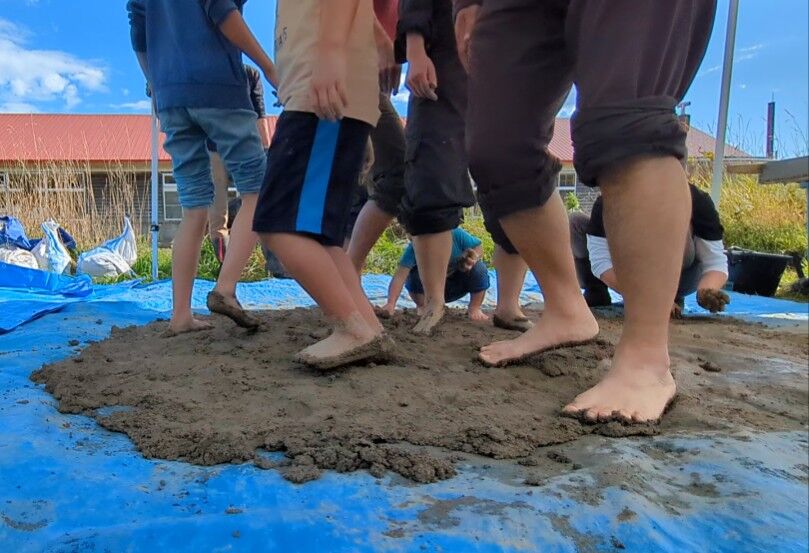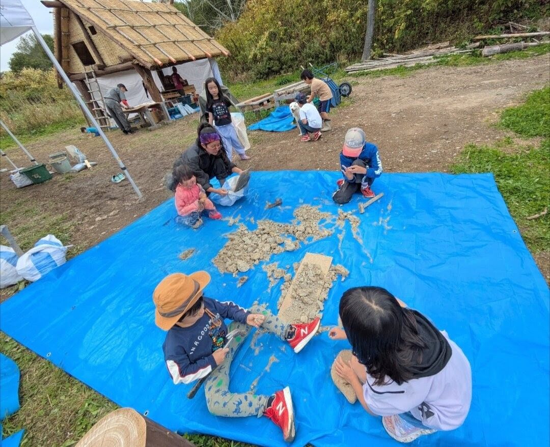 たくさんの方々に参加していただきました「土窯アースオーブン・ワークショップ」。初日は硬い粘土を細かく砕く作業を子供達と一緒に!